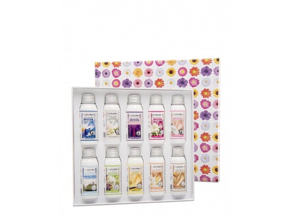 Geschenkkassette Horobox Fiori enthält 10 x 50 ml Parfüme zum Waschen mit natürlichen ätherischen Ölen: White , Gold Argan , Blue , Petali de Peonia , Musica del Sole , Liberty , Fresh Cotton , Imperial Soup , Baby Talco a Vaniglia e Mirra.